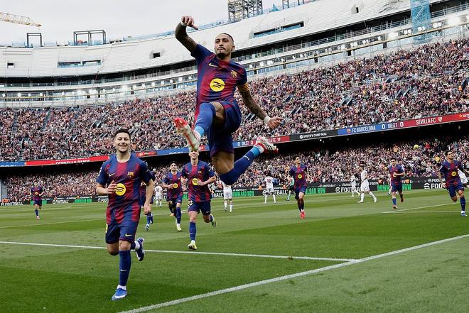 上半场不到40分钟,巴萨凭借拉菲尼亚的点球双响以及奥尔莫的进球,取得3比0领先优势,伤停补时期间,奥索为塞维利亚扳回一球。