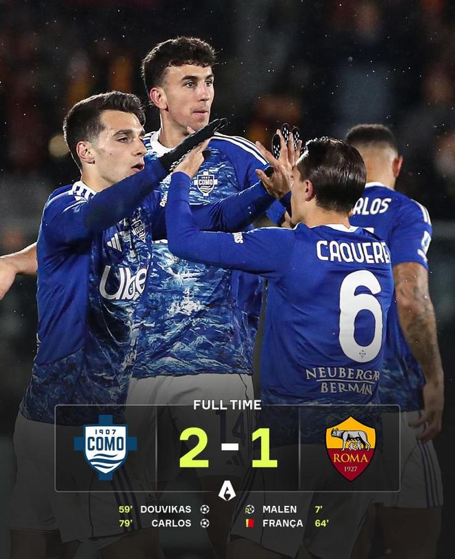 最终比分也定格在此。这样一来,罗马客场惨遭翻盘,连续三场客场未尝胜绩。与此同时,科莫则凭着这场逆转,杀入意甲积分榜第四。这支黑马球队的欧冠梦想似乎正一步步变成现实。