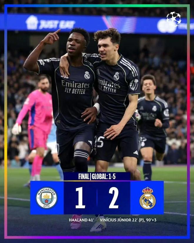 北京时间3月18日凌晨4点,欧冠八分之一决赛次回合较量,首回合3球落败的曼城主场迎战皇家马德里。上半场比赛,B席门前手肘挡出维尼修斯绝佳良机被直红罚下,且送出点球,维尼修斯主罚命中,将总比分扩大至4比0,随后哈兰德后点打空门扳回一城。下半场比赛,多纳鲁马化解单刀,多库、艾特·努里,巴尔韦德和维尼修斯四人进球无效,补时阶段,楚阿梅尼助攻维尼修斯完成双响。最终,皇家马德里客场2比1、总比分5比1双杀曼城,打进欧冠8强。