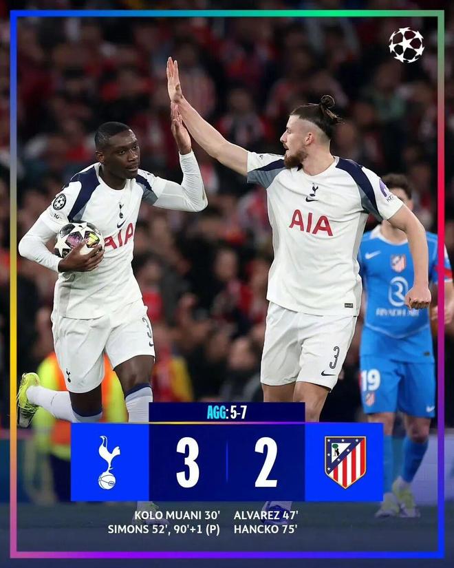 北京时间3月19日凌晨4点,欧冠八分之一决赛次回合较量,首回合2比5输球的托特纳姆热刺回到主场再战马德里竞技。上半场比赛,卢克曼进球被吹,穆阿尼禁区内无人盯防头槌破门先下一城,维卡里奥献神扑。易边再战,阿尔瓦雷斯劲射扳平比分,哈维·西蒙斯世界波建功,汉茨科头槌还以颜色再度扳平比分,哈维·西蒙斯造点亲自主罚命中完成梅开二度。最终,托特纳姆热刺3比2、总比分5比7遭马德里竞技淘汰,无缘8强。