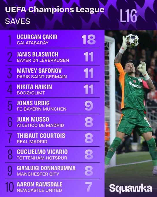本赛季欧冠八分之一决赛两回合扑救总数榜: